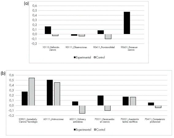 Estos resultados sugieren que el grupo experimental presenta una evolución general de aprendizaje hacia visiones más informadas sobre la NdC. No obstante, los perfiles obtenidos por el grupo control dificultan la extracción de conclusiones. Por ello, con el fin de observar la magnitud de la intervención, se calculó el TE neto teniendo en cuenta la evolución de ambos grupos.