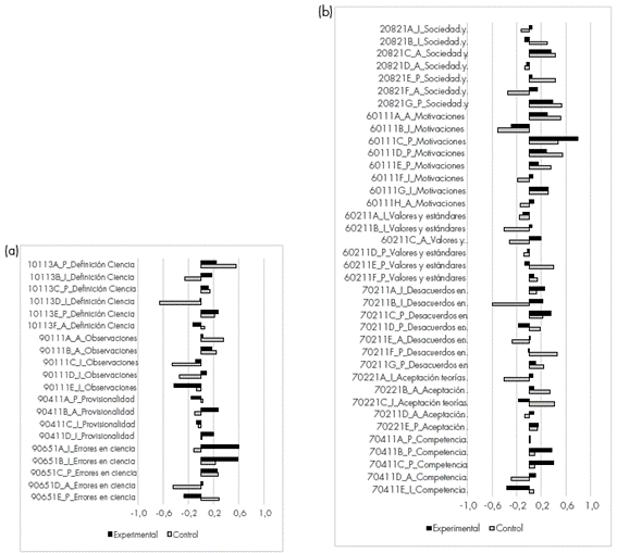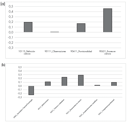 Figura 5 TE neto entre el progreso del grupo experimental y el grupo control para cada ítem. 5a) TE neto para los ítems sobre la dimensión epistemológica. 5b) TE neto para los ítems sobre la dimensión sociológica.