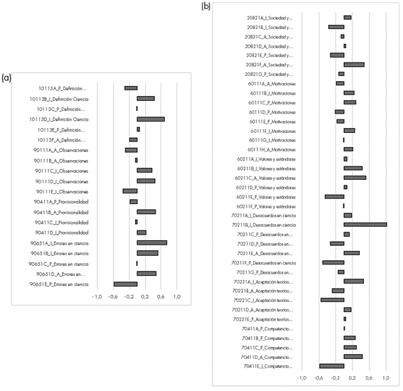 Respecto al TE neto de la intervención para cada ítem (Figura 5), en la dimensión epistemológica (Figura 5a), se observa un TE positivo de la intervención en tres ítems, de nuevo, destacando el ítem 90651_Errores en ciencia. En cuanto a la dimensión sociológica (figura 5b), el perfil de los índices del TE se caracteriza por presentar una evolución favorable general, salvo en el ítem 20821_Sociedad y Ciencia/Tecnología. Si recordamos los índices de TE intragrupales (Figura 3), el grupo control muestra un progreso superior al del grupo experimental en el ítem 20821, lo que se traduce en un TE neto negativo. Este razonamiento se aplica a la evolución del resto de ítems de la Figura 5 y de las frases de la figura 6. Esta metodología de cálculo del TE basada en la diferencia de ganancias entre el grupo control y el experimental nos permite centrarnos en los efectos derivados de la aplicación de la SEA, eliminando la influencia de otras variables en la evolución de las visiones de los participantes sobre determinados aspectos de NdC.