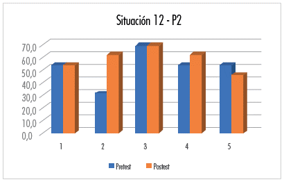 3. Al igual que la anterior cuestión, la situación 13 P-2 pretende establecer si el estudiante identifica las conclusiones, las razones y los contraargumentos de una situación cotidiana relacionada con el requisito del servicio público para obtener un título de grado (Figura 3). Se destaca el aumento de las respuestas adecuadas en 4 de 5 ítems del postest referidos a las partes de un argumento, como la razón -ítems 1 y 5 -, el contraargumento -ítem 2- y la conclusión -ítem 3 -. Es significativo que en el componente razón, el postest tenga un aumento del 23 % en el ítem 1 y de 31 % en el ítem 2. Estos resultados se explican por el avance de los estudiantes en el reconocimiento de las razones que apoyan un argumento.
