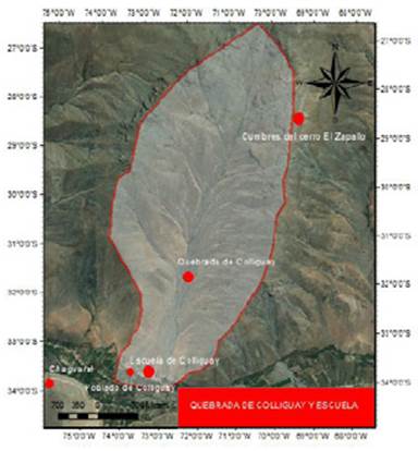 Figura 1 Mapa de la escuela de Colliguay y la quebrada que cruza la localidad