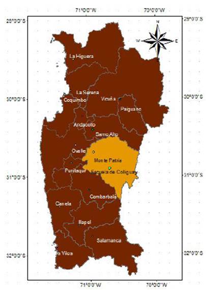 Figura 2 Región de Coquimbo, la comuna de Monte Patria y la zona de la escuela.