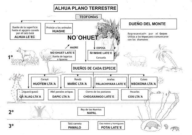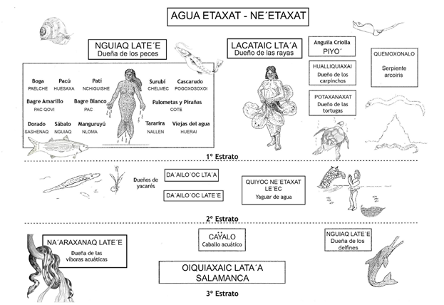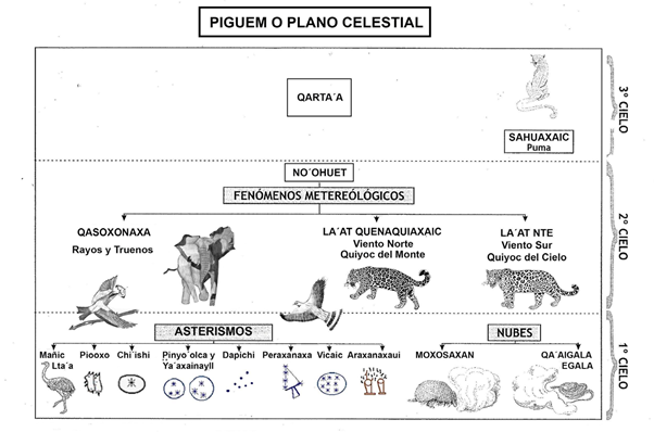 La cultura del pueblo qom, también conocidos como tobas, es de tradición oral y se transmite mediante relatos en los que los seres de poder influyen sobre la vida de las personas. Para la cosmovisión qom, el mundo se encuentra dividido en tres estratos: el Cielo (Piguem) (Figura 1), la Tierra (Alhua) (Figura 2) y el Agua o Submundo (Etaxat) (Figura 3), que a su vez se estratifican (Terán, 2006). Las principales deidades de poder suelen transformarse y así atravesar las distintas capas o estratos que conforman el cosmos. Al esquema original de Terán, se le hicieron algunas modificaciones sugeridas en los distintos intercambios con intelectuales de la comunidad qom. En las figuras podemos ver representados los principales seres en el plano que habitan.