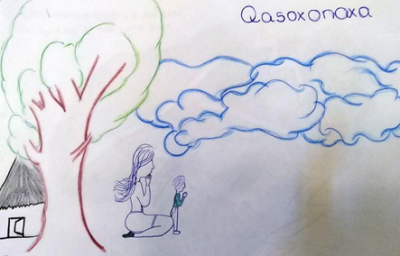 Según Terán (2006), Qasoxonaxa un día cayó en la superficie terrestre desde las nubes y con ayuda de un hombre logró regresar al cielo concediéndole a ese ser humano poderes chamánicos. Los qom también llaman Qasoxonaxa a las montañas, si bien estas no son parte del paisaje de Chaco y Formosa para ellos significa algo muy grande, como puede observarse en las imágenes de la Figura 9. Asimismo, como trabajamos en el relato se cree que este ser está relacionado con las verrugas que aparecen en las manos a causa de tocar las espinillas de las tunas durante las tareas de recolección en el monte. En algunos dibujos se observa el ruego de chamanes y miembros de la comunidad qom donde se le suplica a Qasoxonaxa por la desaparición de verrugas durante los días de tormentas y nubes negras (Figura 10). Se puede apreciar la presencia de Qasoxonaxa como parte de ruegos y suplicas dentro de la comunidad Qom.