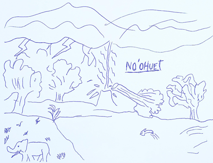 Al observar las láminas realizadas por los estudiantes podemos notar que aparece la palabra No'ohuet escrita varias veces en alguna de ellas (Figura 11). Según Terán (2006), No'ohuet es una teofanía que se encuentra en los tres estratos: Cielo (Piguem), la Tierra (Alhua) y el Agua o Submundo (Etaxat). Ya que en el plano celeste controla fenómenos meteorológicos como el viento caliente o viento norte, en el terrenal se presenta como el ser de poder que controla los seres vivientes del monte y a quien hay que pedirle permiso para cazar. Mientras que en el Agua el yaguareté vive en cuevas y tiene la cualidad de hacer desaparecer a las personas en los ríos (Chadwick, 2020).