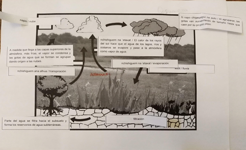 Finalmente, en la Figura 12 se puede observar un collage realizado por los estudiantes del CIFMA en el que vinculan los nombres de los procesos que intervienen en el ciclo del agua, según la visión occidental. Asimismo, agregan inscripciones que no encontraron en las etiquetas entregadas durante la actividad, tal como la palabra araxanac escrita en lengua Qom que aparece en la Figura 12. Araxanac significa víbora o serpiente y es una deidad de poder relacionada no solo con el ciclo del agua sino también con las nubes.