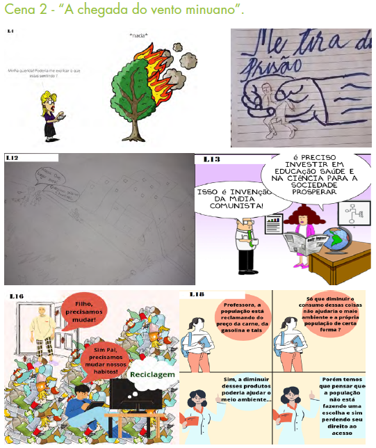 Em todas as etapas, a proposta foi que os materiais didáticos desenvolvidos representassem, de forma crítica, as questões relacionadas à ES trabalhadas em sala de aula com base no filme. A produção de cartuns, realizada na primeira etapa, foi utilizada como base para a construção da cena 2.