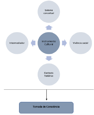 Na figura 2, o instrumento cultural representa a influência humana no processo de aprendizagem, sendo conduzida pelo intermediador, que utiliza o conhecimento como base e o instrumento como suporte. O sistema conceitual trazido pelo intermediador, aliado às vivências sociais do estudante, provocam mudanças nas operações psicológicas. Neste processo, as operações psicológicas atuam como meio de atividade interna, organizadas socialmente, o que influência na tomada de consciência, processo que Vigotski (2001) denomina de internalização.