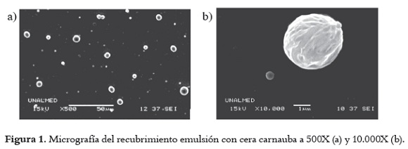 La figura 1 presenta la micrografía a 500 (a) y 10.000 (b) aumentos del recubrimiento en emulsión donde se presenta la dispersión y el tamaño de las gotas de cera de carnauba que en promedio se encuentra entre 2,5 y 5 μm.