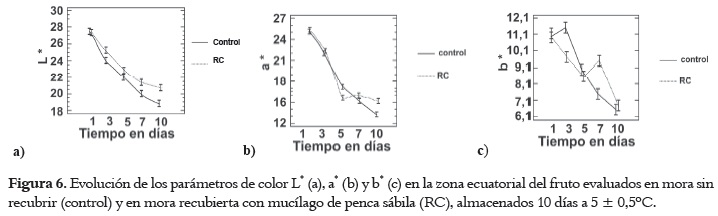 La menor proporción en el cambio de L* para la mora con RC puede deberse a que se presenta un retraso de los procesos de oxidación enzimática que generan el pardeamiento (41, 42), y también por la menor pérdida de humedad que se genera durante el almacenamiento (43, 44). La disminución de los valores de a* (pérdida del color rojizo) se ve afectada probablemente con el incremento de la tasa de respiración y de los procesos enzimáticos que conducen a reacciones de pardeamiento (14) u oscurecimiento enzimático; la mayor disminución de las 3 coordenadas se presentó en este parámetro, con una reducción de 13 unidades; esta disminución muestra similitud a la presentada por Serradilla et al., 2011 (45) en cerezas. La disminución que se presentó en la coordenada b* de los frutos control y en los frutos con RC puede ser atribuido a la deshidratación superficial del fruto (18). Más aún, la reducción de las coordenadas a* y b* se ve reflejada en la pérdida de la tonalidad amarilla, lo que puede indicar evidencia del pardeamiento enzimático. La diferencia significativa entre el control y el tratamiento para el ΔE a partir del día 3 puede deberse al incremento de la respiración y a los procesos enzimáticos, que como resultado provoca la pérdida de algunas pigmentaciones (44). Los RC tienden a retardar los cambios bioquímicos al actuar como barrera, alterando la permeabilidad a los gases, conllevando a un incremento del contenido de CO2 y retrasando los cambios del color externo e interno de la fruta (32).