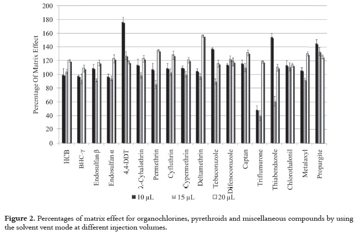 Synthetic pyrethroids (next five pesticides in figure 2) compounds, with high molecular masses (over 400 g/mol), generally were compounds that have some degree of matrix effect (23). In this study, they presented similar results to OC pesticides since all the percentages presented values around 100%.