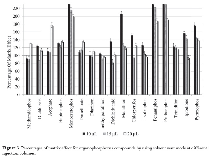 In general, organophosphorus compounds have greater probability to have matrix-induced effects, due to their relatively high polarity, therefore for these pesticides values up to 500% have been reported (22). Figure 3 shows that some organophosphorus (P = O) pesticides (acephate, monocrotophos, Fenamiphos, profenophos and iprodione) have values considerably greater than 100%. However, some organophosphorus containing P = S groups, chlorpyrifos and malathion, the incidence of matrix effect was less pronounced in some injection volumes. On the contrary, compounds as diazinon, parathion-methyl and isofenphos presented percentages close to 100% for all injection volumes.