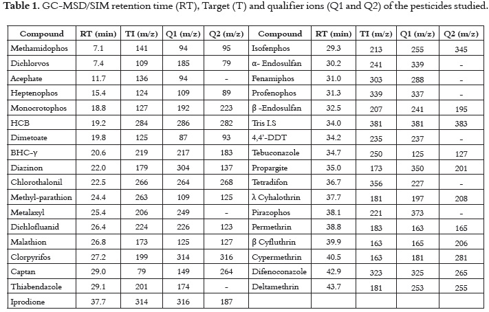 Palabras clave: Plaguicidas, cromatografía de gases, alimentos, espectrometría de masas, residuos.