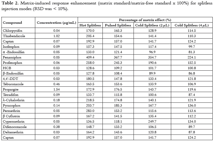 Several authors have reported different variables that influence the chromatographic response enhancement or matrix effects; one of the most important is the pesticide concentration (14, 22), which has an inverse relationship with matrix-induced effects. This relationship is due to low concentrations, since it has a lower number of molecules in the injection port; consequently, the loss of these molecules is more significant that when is working with high concentrations of pesticide (13). Thus, the chromatographic response enhancement decreases with the increase of the injection volume, which can be attributed to a greater number of molecules in the injection port when cold splitless (4 µL) mode is used.