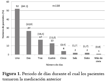 En la figura 1 se representa el número de pacientes frente al tiempo que tomaron la medicación anterior. En este sentido, la mayoría de los pacientes (más del 80%) tomaron el medicamento anterior durante uno (44,1%), dos (22,9%) o tres días (14,4%).