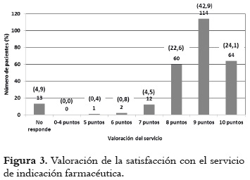 La valoración de la satisfacción (figura 3) con el servicio de indicación farmacéutica fue puntuado mayoritariamente con 9 sobre 10 (42,9%), seguido de 10 (24%) y 8 (22,6%).