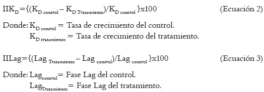 Ya que se asume que la presencia del SLC en el medio de cultivo disminuirá la velocidad de crecimiento (KD) del moho y aumentará el tiempo necesario de adaptación, se calcularon los índices que relacionan la tasa de crecimiento y la fase de latencia de los tratamientos con los del control. Por lo anterior, se consideraron los índices de inhibición de la tasa de crecimiento (IIKD) y el índice de incremento para la fase Lag (IILag); empleando la ecuación 2; y la ecuación 3, respectivamente.