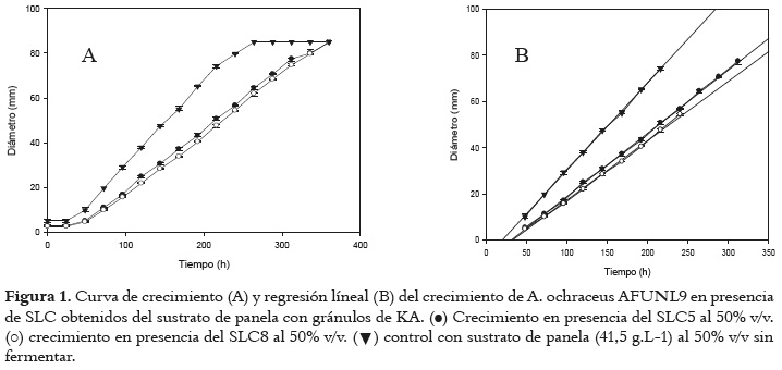 En la figura 1A se observa que el hongo cultivado en el medio control (que contenía el sustrato de panela sin fermentar), alcanzó antes que el cultivado en presencia del SLC5 y SLC8, el diámetro total de la caja de petri. La menor fase de latencia y la mayor velocidad de crecimiento pudieron deberse al aporte de nutrientes que ofreció el sustrato en ausencia de metabolitos inhibitorios.