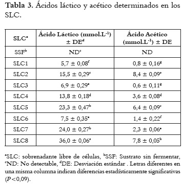 La concentración de los ácidos acético y láctico determinada mediante HPLC en todos los SLC (incluido el control) se presentan en la tabla 3.