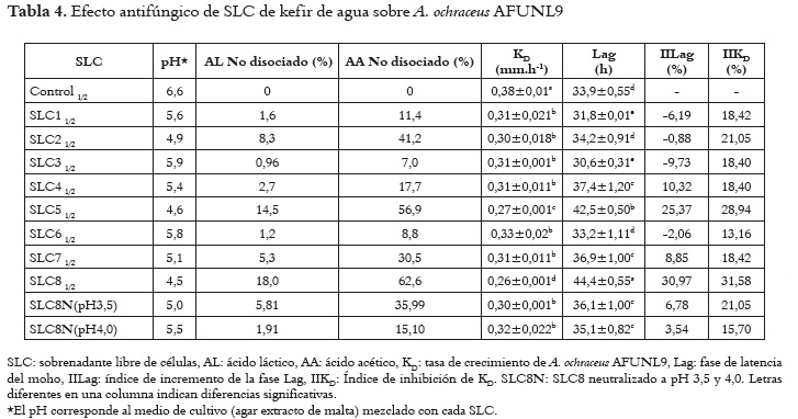 En la tabla 4 se presenta la inhibición fúngica obtenida con cada SLC, además de los índices de inhibición y la concentración de ácido no disociado. Ocho SLC fueron probados en su capacidad antifúngica contra A. ochraceus AFUNL9. Todos los SLC en la concentración 1/2 redujeron la tasa de crecimiento (KD), mientras que ninguna de las demás concentraciones (1/10 y 1/100) fueron inhibitorias y fueron equiparables al control. La mayor inhibición se obtuvo con el SLC8 que disminuyó la tasa de crecimiento (KD) de A. ochraceus AFUNL9 en 32% e incrementó la fase Lag en 31%, con respecto al control. El segundo mejor resultado se presentó en el SLC5, que disminuyó la KD en 29% y aumentó la fase Lag en 25%. A su vez estos dos SLC fueron los únicos que disminuyeron el pH del agar EM por debajo del pKa del ácido acético (4,75) y por tanto contenían la mayor concentración de ácido acético y ácido láctico no disociado, pudiendo ejercer mayor efecto antifúngico. Los sobrenadantes con menor acción antifúngica fueron aquellos con un pH por encima del valor del pKa de ambos AO, lo que correspondió a una menor concentración de AO no disociados.