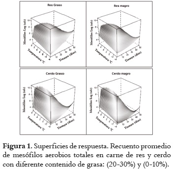 La temperatura y el tiempo de almacenamiento presentaron efectos importantes sobre el crecimiento de microorganismos aerobios mesofilos y enterobacterias, lo cual es consecuente con estudios desarrollados en materiales cárnicos (5).