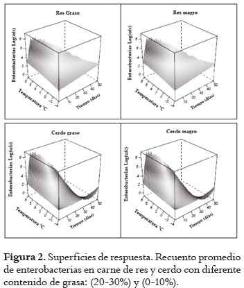 El tiempo y la temperatura de almacenamiento, afectaron significativamente los recuentos de enterobacterias en la carne deshuesada de res y cerdo tal como se observa en la figura 2.