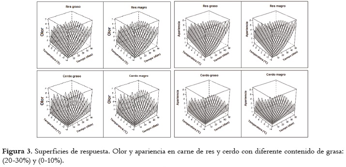 La apariencia general fue afectada significativamente por el tiempo y la temperatura de almacenamiento, tal como se aprecia en la figura 3; el contenido de grasa no presentó un efecto significativo. La apariencia general de la carne de cerdo fue muy estable, incluso a altas temperaturas (4 y 8°C); la de res, por el contrario, presentó grandes cambios durante el tiempo de almacenamiento a las temperaturas de -2 y -4°C.