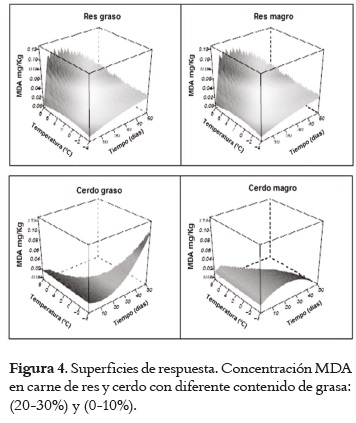 A nivel estadístico en la figura 4, se detectó que las concentraciones de malondialdehído determinadas a diferentes contenidos de grasa, temperaturas y tiempos de almacenamiento, fueron muy bajas (cercanas a 0), indicando un efecto insignificante de estas variables respecto al deterioro de las muestras.