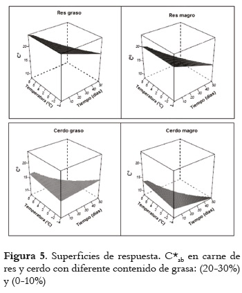 El Croma (C*ab) obtenido en la carne de res con alto y bajo contenido de grasa, disminuyó significativamente y de manera lineal, en función del tiempo de almacenamiento; la temperatura no tuvo efecto significante. En la carne de cerdo con alto contenido de grasa, el croma no se vio alterado significativamente por ninguno de los factores evaluados, sin embargo, la carne con bajo contenido de grasa, si presentó una disminución lineal del croma respecto al tiempo de almacenamiento; mientras que la temperatura no tuvo un efecto significativo, como se presenta en la figura 5.