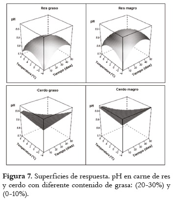 En la carne de cerdo, el pH se mantuvo prácticamente constante respecto al tiempo y la temperatura de almacenamiento; a nivel estadístico se presentó una diferencia poco significativa entre los niveles de grasa alto y bajo.