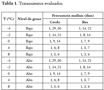 La carne se empacó en bolsas de polietileno de alta densidad (tasa de transmisión de oxígeno 2.739ml/ m2/24h/atm a 30ºC, 75% HR y tasa de transmisión de vapor de agua 4,7 g/m2/24h a 30ºC, 90% HR), con pesos entre 250 y 300 g y se almacenaron a temperaturas de -4, -2, 0, 4 y 8°C, en cámaras Thermo Scientific, Model 815 (precisión de ± 0,1°C). Las muestras de 0, -4 y -2°C, fueron sometidas a un enfriamiento rápido después del deshuese. Cada tratamiento fue evaluado en 3 períodos de tiempo diferentes (Tabla 1), los tiempos fueron definidos de acuerdo a las experiencias previamente obtenidas de almacenamiento del producto y de acuerdo a los tiempos de interés de aplicación industrial, luego se realizaron evaluaciones adicionales para mejorar la estimación de los modelos en los límites.