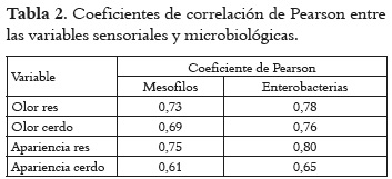 En la tabla 2 , se reportan los coeficientes de correlación de Pearson de los cambios presentados respecto al olor y la apariencia general, se halló una correlación directa con los recuentos de microorganismos aerobios mesófilos totales y las enterobacterias; siendo un poco más alta en la carne de res.