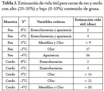 La estimación del tiempo de vida útil, se determinó a partir de las variables más influyentes en el deterioro de las muestras tales como recuento de mesófilos aerobios totales, recuento de enterobacterias, olor y apariencia general; se asignaron puntos de corte en los modelos de las variables críticas y se determinó el tiempo de vida útil. El comportamiento de la carne de res y cerdo con altos y bajos niveles de grasa, almacenadas a las diferentes se resume en la Tabla 3.