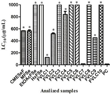 The positive control (K2Cr2O7) induced toxic effect in A. salina with high potency (LC50= 13.90 ± 0.29 mg/mL). In contrast, the CMESeF and MFSe had the same effect than the control although with less potency since 40-fold higher concentrations (LC50= 567.0 ± 12.1 mg/mL and 565.1 ± 49.9 mg/ mL, respectively) were used, whereas with EtOAcFSe and HxFSe fractions 72-fold higher concentrations (LC50 > 1000 mg/mL) were required. Similar results were obtained with fractions separated by VLC since LC50 of FVLC2, FVLC4, and FVLC9 were 518 ± 26.0, 840.1 ± 86.6, and 450 ± 0.0 μg/mL respectively, while the LC50 for FVLC3, FVLC5, FVLC6, FVLC8, and FVLC10 was > 1000 μg/mL. FVLC1 exhibited a toxic effect similar to the positive control but with 7-fold higher concentration (LC50= 123.5 ± 0.2 mg/mL). Interestingly, FVLC7 (LC50= 16.0 ± 0.0 mg/mL) had the same toxic effect than the control positive (Figure 1). The negative control had no toxic effect.