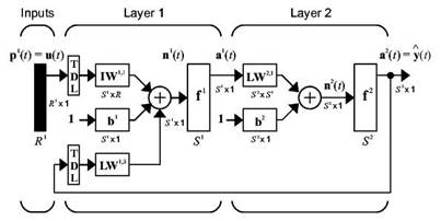 Unlike the feedforward network, where there is an algebraic relationship between input and output, this architecture contains memory. There is feedback on the output and the inputs have a certain delay. The basic equation of the network is: