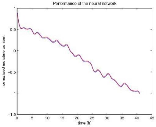 In Figure 9 the response of the Dynamic Neural Network to validation data is compared to the original data. As can be seen, the result follows almost perfectly the dynamics of the process. In Figure 10 the error between the predicted and the real values of the moisture are presented.