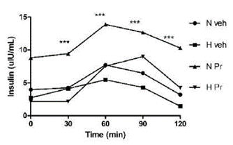 Oral glucose tolerance test (OGTT) was performed on rats two weeks after the beginning of Prosopis ruscifolia treatment. Two groups of rats with hyperglycemia and two groups with normoglycemia (n=10) received distilled water (0.1 ml/10g of weight, p.o., Hveh and Nveh) or Pr ethanolic extract (75 mg/kg, p.o.; HPr75 and NPr75) once a day for 14 days. On day 14th, rats received orally D-glucose at 1.5 g/kg body weight (14). Blood samples were drawn from the lateral tail vein using tubes with EDTA at 0, 30, 60, 90, and 120 min after glucose administration to determine glucose in plasma, insulin, and incretin. A specific DPP-4 inhibitor (DPP-IV inhibitor, Millipore, Montreal, Canada) was immediately added to the pre-chilled EDTA tube. Immunoassays measured insulin and incretin levels in plasma (Rat Insulin ELISA kit and GLP-1 Total ELISA kit, respectively. Both kits are based on a Sandwich ELISA (15)).