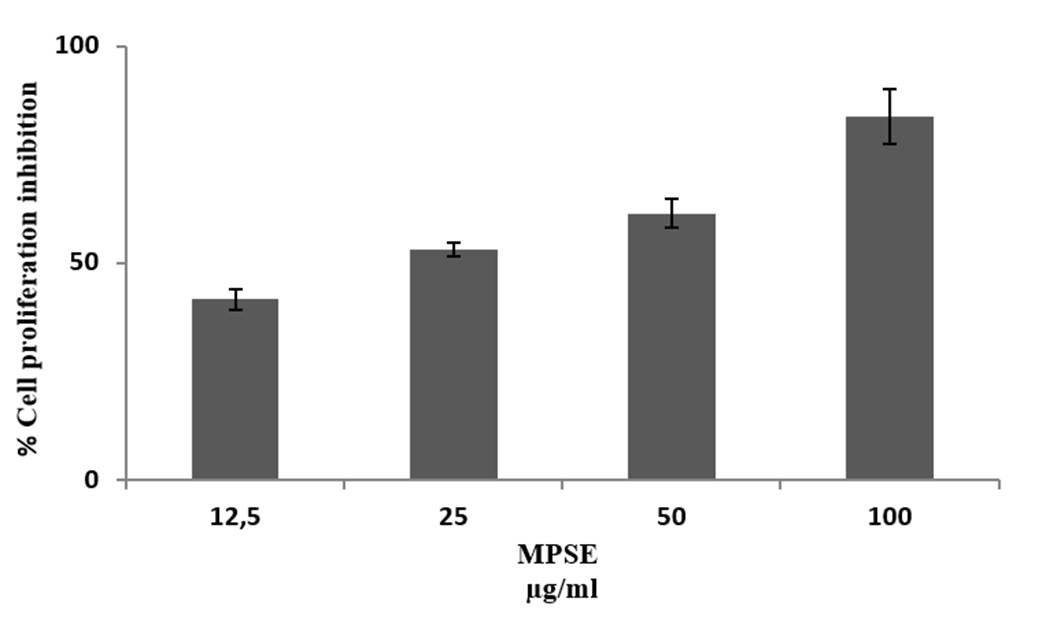 MPSE inhibited in vitro proliferation of CAL 27 cell lines. At 100 µg/mL, MPSE showed more than 80% inhibition (Figure 1). IC50 of MPSE was found to be 25 µg/mL, significantly higher than doxorubicin IC50 = 0.5 μg/mL 15. The extract was active below 100 µg/mL, demonstrating the presence of the potential compounds in the extract and showing anti-cancer activity.
