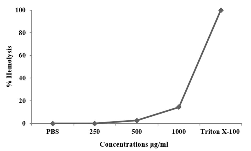 The hemolytic effect of MPSE augmented with increasing treatment concentrations. MPSE caused 14.3 % hemolysis at 1,000 μg/mL. This hemolysis was below 20%, demonstrating the non-hemolytic property of this extract. The positive (Triton X-100 (0.5%) control showed full hemolysis (100%), while the negative control (PBS-treated RBC cells) did not observe hemolysis (0%) (Figure 2).