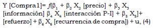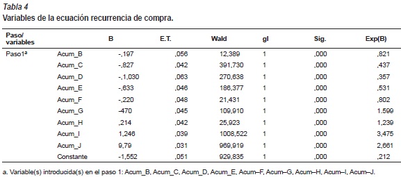 De acuerdo a la ecuación de regresión logística para la modelización de la compra a partir de este parámetro, es posible afirmar que en todos los casos se alcanza la significación estadística (ver Tabla 4); sin embargo, comparado con la conducta recurrente caracterizada bajo la notación "G", la conducta recurrente "J" multiplica por 2.661 la probabilidad de comprar y de acuerdo a esto la variable independiente recurrencia de compra presenta una mayor influencia que las variables refuerzo, precio e información (R2 de .000; .033 y .002 respectivamente). En este modelo, adicionalmente, se estima que casi todos los incrementos en los valores de B calculado disminuirán la probabilidad de compra, ya que la mayoría de los signos de los estimadores son negativos, y esto supone que incrementos en la variable asociada cuando presenta signo negativo causará disminuciones en la variable dependiente P (Y=1).