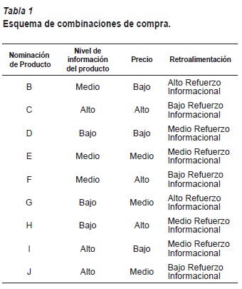 De igual forma, se diseñaron los niveles de cada variable a partir de escalas de valoración y asignación subjetiva de precios e información. Esto permitió que los contenidos con los cuales se construyó el ambiente de elección fueran probados, de manera que se garantizara que los niveles manejados tanto para la información, como para los precios y las consecuencias administradas asociadas a los productos y las marcas, correspondieran a los valores probados. Lo anterior se realizó solicitando a 80 personas diferentes a los participantes, pero con las mismas condiciones sociodemográficas, que establecieran a partir de escalas de valoración subjetiva las puntuaciones consideradas para los contenidos informativos, los precios y las consecuencias. Se solicitó a las personas que asignaran valores (precios) a los productos según su consideración subjetiva. Posteriormente se tomaron los valores asignados y se transformaron a rangos para construir los valores finales de la variable precio, estableciéndose precios altos medios y bajos. En cuanto a los contenidos informativos de los productos (variable información) referidos a las descripciones sobre los beneficios, se establecieron los niveles alto, medio y bajo nivel de información de acuerdo a las características reales de venta y exposición de los productos, estableciendo el número de palabras que los describían y sacando un porcentaje de 100% para alto nivel de información con el total de palabras, un 50% del total de palabras para el nivel medio de información, y un 10% del total de palabras para el nivel bajo de información. Para el establecimiento de los niveles de refuerzo informacional se solicitó al grupo de personas que describieran los aspectos que los llevarían a comprar el producto y a partir de estas valoraciones se establecieron los altos, medios y bajos niveles de reforzamiento informacional según las caracterizaciones realizadas por las personas. Una vez probados los contenidos (información, precios, consecuencias informacionales, significado y conocimiento asociado a los productos y sus marcas), se procedió a diseñar las condiciones del aplicativo a las que serían expuestos los participantes. Para esto, a cada marca se asoció el mismo número de productos (9 por cada marca, para un total de 27 productos). Esta cantidad de productos fue el resultado del establecimiento de las combinaciones posibles para los niveles en los que se manejó cada variable, esto es: niveles alto-medio-bajo para el precio, la información y las consecuencias, los cuales en conjunto describen las condiciones antecedentes y consecuentes de elección. Seguidamente se diseñó cada opción de elección donde a cada producto se asignó aleatoriamente una combinación particular de precio-información y refuerzo informacional, dando como resultado el siguiente esquema para el conjunto de elección con su respectiva codificación (ver tabla 1).