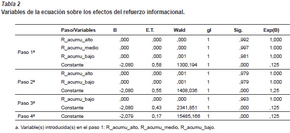 En la prueba de los parámetros (cada variable independiente), los resultados que se observan en la Tabla 2 para la ponderación de la variable refuerzo de la compra como una variable presumiblemente explicativa, indican que esta variable no tuvo entrada en el modelo inicial para el cálculo de las estimaciones bivariantes (compra-refuerzo). En este cálculo, el proceso iterativo con método hacia atrás, terminó en el cuarto paso con un modelo no significativo y por tanto no predictivo de la probabilidad de compra a partir del refuerzo. Se observa en la Tabla 3 que el valor p asociado fue mayor de .000 y por tanto el modelo para los efectos individuales de los niveles de refuerzo informacional no es estadísticamente significativo. Así mismo, el valor de B es 0.000 lo cual significa que el refuerzo informacional, de manera individual, no presenta influencia alguna sobre la proporción de varianza de la variable dependiente y por tanto se estima que este parámetro no es predictivo de la compra.