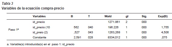 En una segunda etapa de modelización de la compra a partir de un parámetro se realizaron las estimaciones para la medida de influencia de la variable precio como explicativa de la conducta de compra. De acuerdo con el proceso de modelización de la compra según esta covariable, se observó en primera medida que efectivamente el precio es una variable que entra en el modelo. En relación con los resultados de la Tabla 3, el precio y sus niveles mantienen una significación estadística (p<.05) en el contraste de hipótesis, que las relaciona con la variable dependiente compra, lo cual indica que esta variable representa una medida de estimación de la variable compra en el estudio.