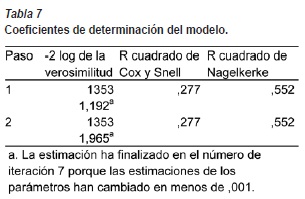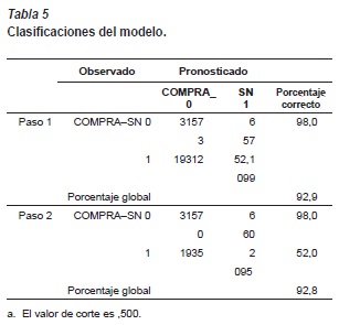 En una etapa posterior para la estimación de la capacidad explicativa de la covariable denominada recurrencia de compra, se observó un coeficiente de determinación de Cox y Snell de .103 y de Nagelkerke de .206, lo cual indica que la recurrencia de compra como variable predictiva explica la variable dependiente compra en un 10% a un 20%.