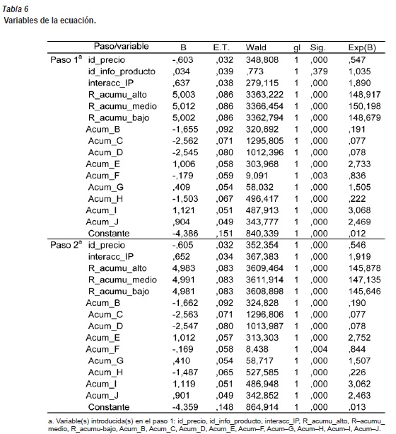 El resultado final expuesto en la Tabla 6 muestra los coeficientes B de cada covariable bajo el método hacia atrás, el error estándar (E.T), el estadístico de Wald del contraste de hipótesis (siendo H0 : B=0), los grados de libertad (df=1) y el valor p asociado al contraste (Sig.) para cada variable control. Aparece también EXP(B), que corresponde a la OR (Odds Ratio: medida que evalúa la fuerza de asociación entre las variables) de las variables analizadas (precio, información, interacción precio-información, reforzamiento y recurrencia de compra) con la dependiente predicha (compra). Se observó entonces que la iteración en el cálculo del modelo terminó en el paso dos, en el cual se excluyó el parámetro información (id_info_producto en la Tabla 6) dado que su valor de significancia fue de .379 el cual asociado al estadístico de Wald del contraste de hipótesis (siendo H0 : B=0) impide que sea contemplada en el paso dos como variable explicativa de la compra puesto que los cambios en esta variable información no tendrán efecto alguno en la variable dependiente del modelo y de esta forma no se contempla como un factor relevante de predicción de la variabilidad de Y (variable dependiente). En el paso dos del proceso de iteración se observó que las demás variables fueron incluidas en el modelo y por tanto aportan a la explicación de la variabilidad de la compra como variable de respuesta. En cada caso, las estimaciones de los parámetros B indican los respectivos incrementos o decrementos de las variables asociadas, por ejemplo, en el caso del estimador de precio se observa que su incremento causará disminución en la conducta de compra (aunque no es posible conocer la magnitud). Por otro lado, se observa en la tabla 6 que incrementos en el refuerzo generan incrementos en la compra (desconociendo igualmente la magnitud del cambio), al igual que incrementos en la conducta recurrente tendrán una influencia sobre los incrementos de Y. Las anteriores afirmaciones pueden realizarse dado que los coeficientes de regresión de las variables son estadísticamente significativos.