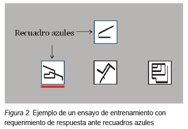"A continuación verás una figura dentro de un marco negro en la parte central superior de la pantalla. Seguido a esto verás otras tres figuras debajo de la primera. El computador indicará con una línea roja cuál de las tres figuras de la parte inferior corresponde con la figura que aparece arriba. Atiende cuidadosamente a esta relación. Tu tarea consiste en hacer clic sobre la figura subrayada en rojo cuando ésta aparezca dentro de un marco azul" (ver Figura 2).
