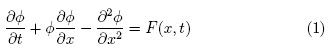 siendo -∞ <x< ∞, t ≥ Oyla condición inicial Φ(x,0) = Φ0(x). El termino F(x, t) se encuentra asociado a fuerzas externas y Φ0(x) es el perfil al tiempo t = 0 de Φ(x,t). Para el caso homogéneo F(x,t) = 0 se conocen soluciones solitónicas [7] y otro conjunto de soluciones obtenidas mediante la transformación de Cole-Hopf [8, 9]. En lo siguiente se aplica esta transformación con el fin de estudiar el caso no homogéneo.