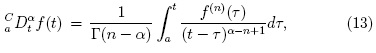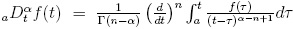 donde α y t son valores reales que denotan los límites en los que se debe incluir información de f (t) con el fin de evaluar la derivada, n es el mayor entero que satisface n - 1 ≤ α < n y Γ(z) denota a la función Gamma [6].