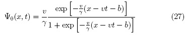 Tal como se estudió en la sección anterior, la ecuación (9) posee soluciones solitónicas en x < xe. Para la ecuación (10), existen soluciones viajeras que dan lugar a solitones en la región x ≥ xe. Así, buscando soluciones de la forma