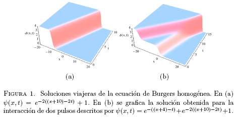 que no es una onda viajera. La ecuación (27) es la solución de un solitón de la ecuación de Burgers normal obtenida en la ecuación (8); se nota que el efecto de las constantes C1, C2 es establecer el desfase b del pulso. Al incorporar el resultado (27) en el análisis de la ecuación fraccionaria de Burgers se obtiene: